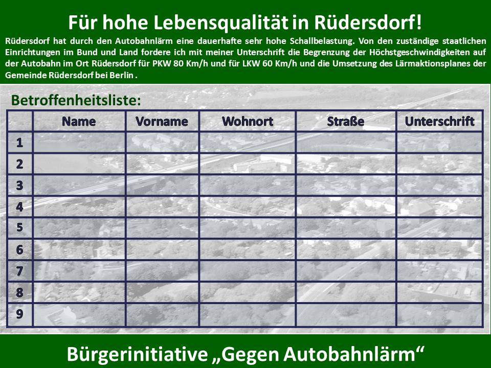 Aus vorbereitenden Gesprächen mit Bundestagsabgeordneten und einem Erfahrungsaustausch mit der BI in Birkenwerder strebt die Bürgerinitiative „Gegen Autobahnlärm“ die Einholung von mindestens 3000 Unterschriften von betroffenen Bürgern ein. Hierdurch soll auf die außergewöhnliche Autobahnschallbelastung durch die Brückenbauwerke , die landschaftliche Situation in Rüdersdorf und die autobahnnahen Wohngebiete hingewiesen werden. Neben den leider nicht mehr veränderbaren Bausünden der Vergangenheit soll der unzureichende Schallschutz beim Ausbau der Autobahn kritisiert werden und technische Änderungen angemahnt werden. Die Teilnehmer waren sich im Klaren, dass dieses Ziel nur mit vereinten Kräfte und durch eine breite und direkte Bevölkerungsansprache in den Wohnlagen sowie die Einbeziehung betroffener Einrichtungen wie Schulen, Kita und Vereine zu erreichen ist. Ergänzend dazu ist auch eine Auslegung der Unterschriftenlisten an geeigneten Stellen im Ort vorgesehen.